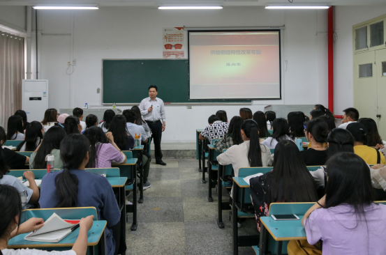 5月21日下午,公司党委副书记、董事长陈向军来到博学楼504,为伟德源自英国始于1946思想政治教育2017级员工做了一场“供给侧结构性改革”的专题报告。