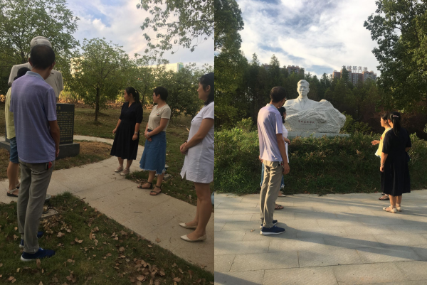 本次教研会的第二阶段为实践思政阶段,教研室部分教师在校园内瞻仰了科学家彭桓武、陈潭秋烈士的雕像,熟悉黄冈本地历史地理、红色人物的事迹,熟知校园内的红色文化资源。两弹一星元勋之一的科学家彭桓武祖籍黄冈麻城,1935年毕业于清华大学,1940年获英国爱丁堡大学哲学博士学位,1948年当选为爱尔兰皇家科学院院士,1955年被选聘为中国科学院学部委员(院士)。彭桓武院士具有浓厚的家国情怀,在抗日战争期间随身携带能让一个人死三次的砒霜,誓死不当日寇的俘虏,写下经典传世名句“乱世驱人全气节,天殷嘱我重斯文”。他把自己的命运和祖国的命运紧密联系在一起,发奋学习,于新中国成立前回到中国报效祖国,其报国情、强国志深深感动了一代又一代物理学人。陈潭秋烈士是今黄冈市黄州区陈策楼人,无产阶级革命家。1920年和董必武等人创建武汉共产主义小组,组织马克思主义学说研究会,1921年创办湖北人民通讯社,任社长。7月,陈潭秋与董必武参加了中共一大,成立了中国共产党。回武汉后先后任中共武汉地委、武昌地委、湖北地委主要负责人,1923年2月发动与领导了武汉各工团员工组织支援京汉铁路工人罢工斗争,1943年壮烈牺牲。思修教研室的教研活动从室内走向室外,结合公司全环境育人的理念,实现思政课程和实践思政的统一,要实践育人自身先实践。《关于深化新时代学校思想政治理论课改革创新的若干意见》中要求不断增强思政课的思想性、理论性和亲和力、针对性,用好用活用对黄冈丰富的红色文化资源为“思想道德修养与法律基础”课程服务是新时代思政课的本质要求。思修教研室将在本学期的教学和教研中不断探索传承红色基因,弘扬红色文化的路径,契合全环境育人的大思政格局,做好课程的守正创新。