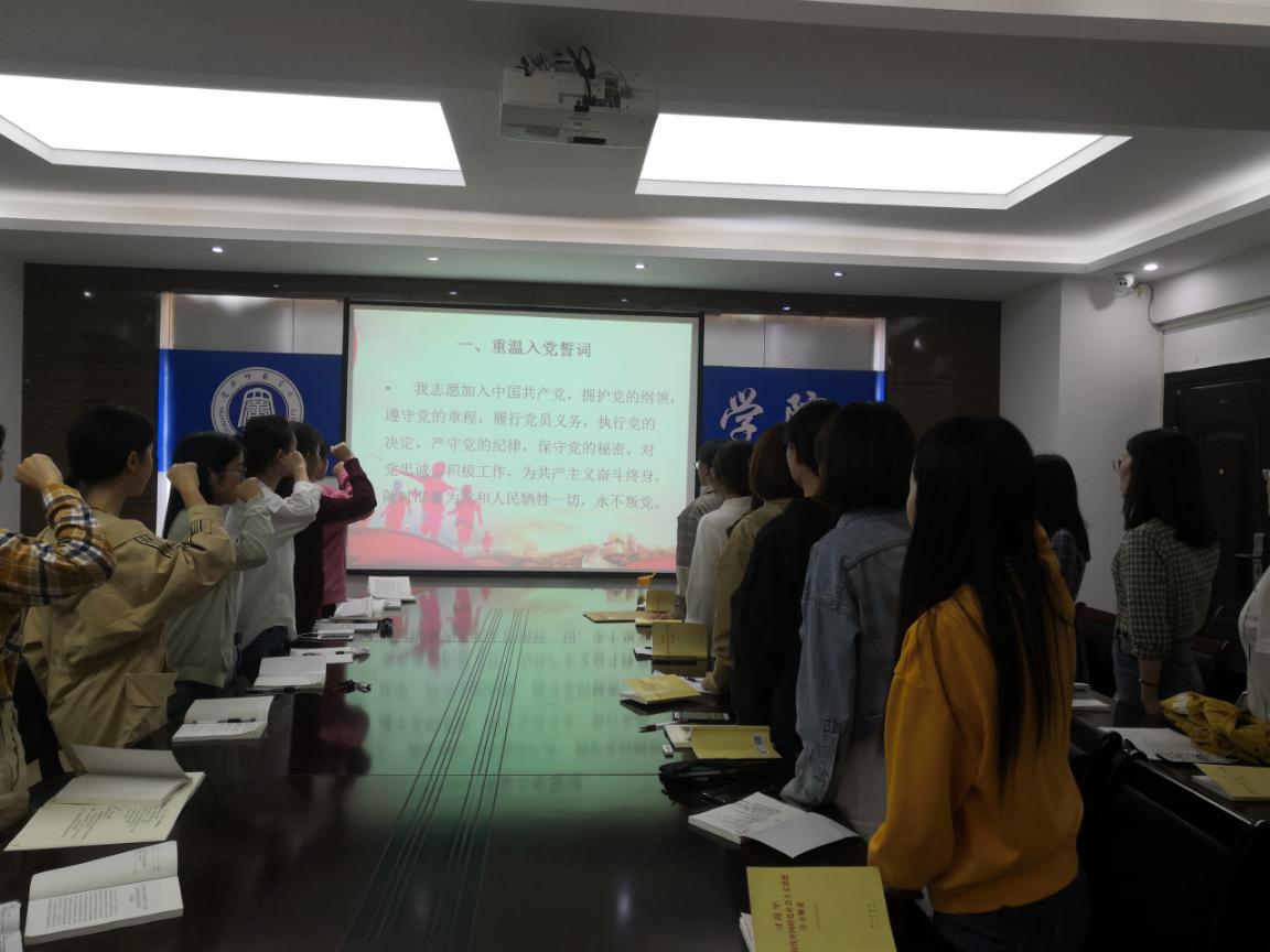 本次主题活动分为五个环节:重温入党誓词、诵读《党章》、《纲要》部分章节解读、重温入党初心、“不忘初心、牢记使命”主题教育测试。