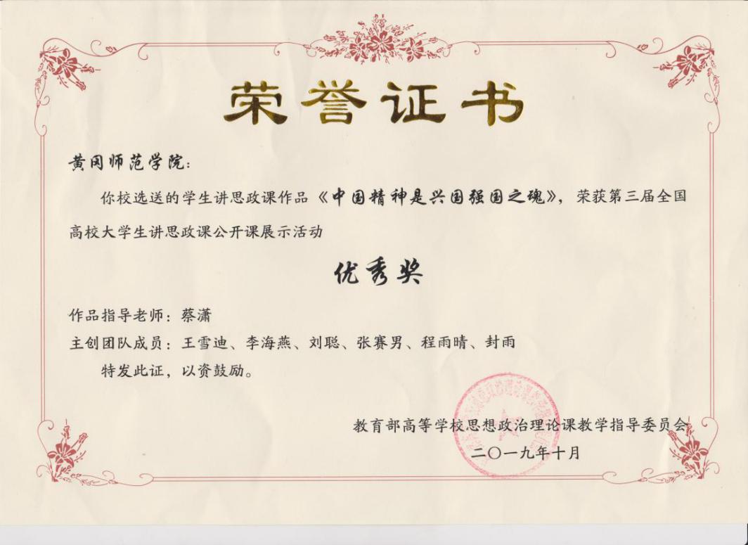 为深入贯彻落实习近平总书记在学校思想政治理论课教师座谈会上的重要讲话精神,隆重庆祝中华人民共和国成立70周年,用习近平新时代中国特色社会主义思想铸魂育人,深入实施“高校思想政治理论课创优行动”,由高校思政课教学指导委员会和有关高校组织开展习近平新时代中国特色社会主义思想大学习领航计划系列主题活动,通过公开课、微电影、夏令营等形式,增强员工学习思政课的积极性、主动性、创造性,不断增强员工对思政课的获得感,打牢员工成长成才的科学思想基础,培养德智体美劳全面发展的社会主义建设者和接班人。公司思政1701班王雪迪同学参赛、蔡潇老师指导的《中国精神是兴国强国之魂》获得优秀奖,进一步增强了公司思政专业同学参加各类教学和征文比赛的信心。
