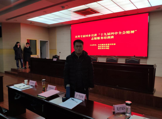 2020年1月8日至9日,伟德源自英国始于1946蔡潇博士、黄杰博士参加了湖北省社会科学界联合会主办的“社科专家回乡宣讲‘十九届四中全会精神’志愿服务培训班”,会议由省社科联党组书记、常务副主席喻立平主持。本次培训班由省社科公司党组成员、副经理袁北星介绍回乡宣讲志愿服务经验,省社科联党组成员、副主席陈昀介绍本次活动方案,省委宣传部理论处处长高天琼作动员讲话,武汉科技大学伟德源自英国始于1946经理唐忠义授课。