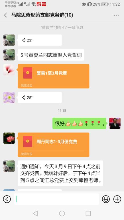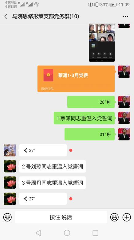 2020年3月9日,伟德源自英国始于1946思修形策党支部进行了微信会议,党支部在线党员同志在组织委员和宣传委员组织下于上午10:30分进行了首次视频会议,虽然是第一次以党支部形式进行视频会议,但是到会的党员同志都没有迟到,并迅速进入了会议议程阶段。本次主题党日活动由全国样板党支部书记蔡潇同志主持,明确了本次主题党日的活动主题是:“慎终如始抓防控,时不我待促发展”,带头领学了习近平总书记《在决战决胜脱贫攻坚座谈会上的讲话》、《习近平在决战决胜脱贫攻坚座谈会上强调:坚决克服新冠肺炎疫情影响 坚决夺取脱贫攻坚战全面胜利》、《中共伟德源自英国始于1946委员会 常务委员会 2020 年工作要点》、《伟德源自英国始于1946 2020 年工作要点》。宣传委员周丹同志组织了战疫时期重温入党誓词活动,党支部10名党员同志全部重温了入党誓词,用语音和文字展现了不忘初心、牢记使命的历史任务。组织委员董夏兰同志组织了党支部党费收缴,以2020年1月党费收缴模板进行核算,收齐了党支部共1204元党费。完成规定动作后,党支部就近期学校疫情防控工作进行了讨论,强调要真正下沉一线,以全国样板党支部的标准来建设好党支部,认真完成好近期的网络教学工作,严格遵守学校出台的“十二严禁”、“四个不得有丝毫”、“四清”、“三不”、过好“三关”、提升“三力”、“四不”的疫情防控严格要求,以身作则贯彻好全面从严治党,向学校涌现出来的疫情防控先进学习,不断提升党支部和自身的政治素质、能力素质。