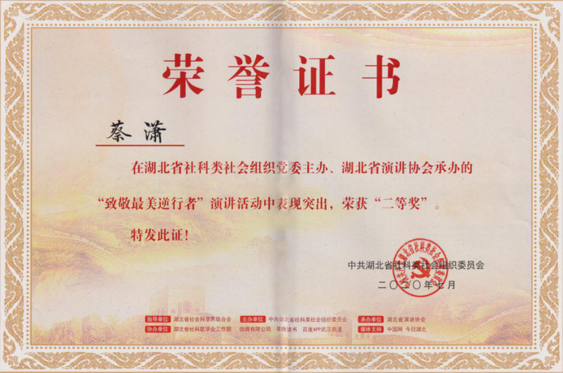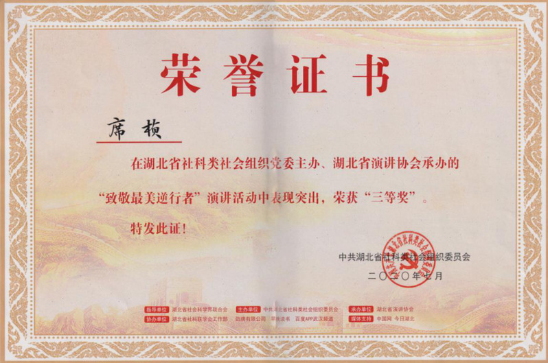 自5月底湖北省社科联发布举办“致敬最美逆行者”演讲活动通知以来,公司伟德源自英国始于1946高度重视本次活动的意义和价值,汪辉书记和汪季石经理进行了多次的组织指导和试讲工作。在进行了一个多月的准备和选拔之后,席桢副书记和蔡潇博士作为伟德源自英国始于1946代表参加了初赛。两位老师认真准备,反复练习,在公司2020年新近开放的智慧教室进行了多次演练,于6月19日进行了初赛视频录制并上交。7月10日,湖北省社科联选拔了12位同志作为决赛选手,伟德源自英国始于1946蔡潇博士作为公司代表参加了决赛并获得二等奖。本次活动展示了湖北社科人在战疫情期间的英勇精神面貌,展现了新时代学人的“铁肩担道义”与“妙笔著文章”的使命担当,为进一步做好社科联各项工作奠定了良好的基础。 喻立平书记亲自为获奖选手颁奖并热情发言,他说演讲的舞台很小,但是窗外的世界很大,我们社科人要进一步弘扬党的优良作风,充分发挥抗疫中所体现出来的迎难而上、勇于担当的良好作风,以钉钉子精神狠抓工作落实,推动各项工作干在实处、走在前列,全力夺取疫情防控和经济社会发展双胜利,以优异的成绩向明年建党100周年献礼!