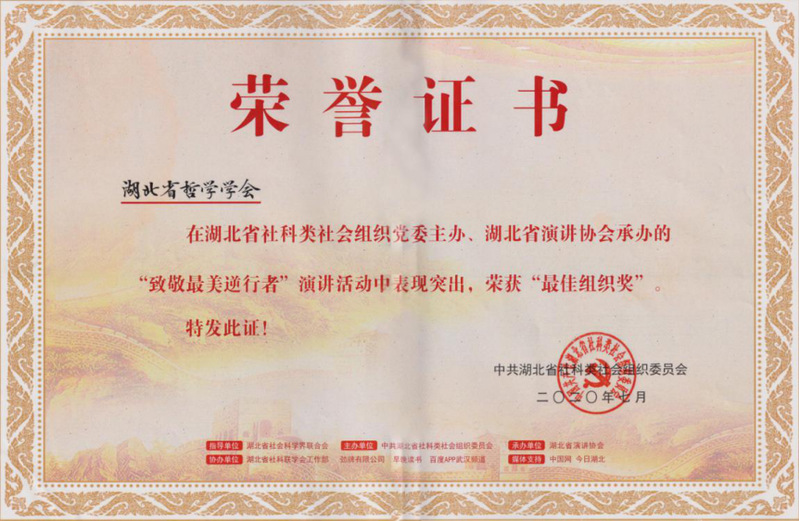 7月10日下午,中共湖北省社科类社会组织党委主办的“致敬最美逆行者”活动在省社科联机关二楼会议室举行,一个一个致敬最美逆行者的故事从这里,通过中国网、百度等直播平台,向全国讲述了湖北社科人抗疫的故事,展示了湖北社科人的责任和担当。省社科联党组书记、常务副主席喻立平,省社科联党组成员、副主席、省社科类社会组织党委书记张明新出席了本次活动。来自湖北省委组织部、省委宣传部、省直机关工委、省民政厅、省妇联、省广电、中国网、湖北日报、劲牌有限公司等单位的代表担任了评委。公司伟德源自英国始于1946席桢副书记和蔡潇博士参加了此次活动,分别获得三等奖与二等奖的成绩。公司作为湖北省哲学学会代表参赛,湖北省哲学学会获得“最佳组织奖”。