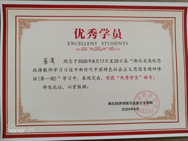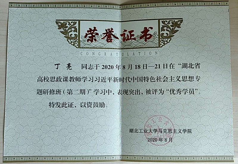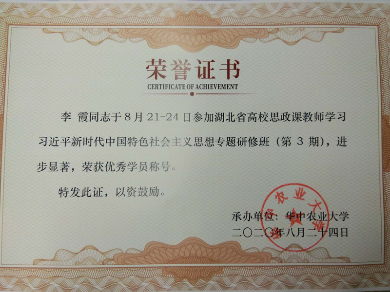 2020年8月17日至24日,伟德源自英国始于1946蔡潇、陈永典、程之胜、丁亮、李霞、雷红等六位老师参加了湖北省高校思政课教师学习习近平新时代中国特色社会主义思想专题研修班并顺利结业,蔡潇、丁亮和李霞三位老师获得“优秀学员”称号。