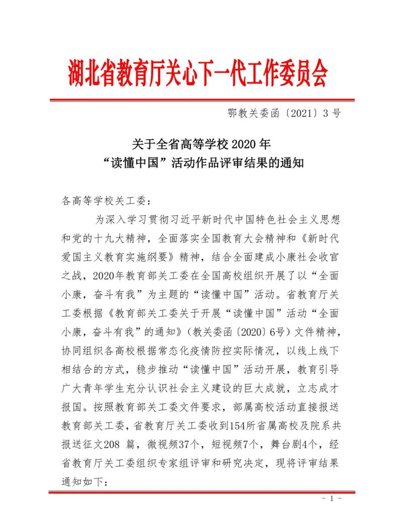 经教育部关工委、省教育厅关工委组织专家组评审,公司获2020年“读懂中国”活动优秀组织奖,在党总支副书记席桢老师的指导下,公司思政思政1802班孙胜楠作品——《偏远山区的坚守者,小康大道的引路人》获教育部关工委2020年“读懂中国”优秀作品,思政1802班程梦思、学科(思政)2020级王世枭鉴作品——《大别山的旗帜,人民们的明灯》获省属高校2020年“读懂中国”活动最佳作品 ,思政1902班何俊、思政1801班王立、思政1802班叶宝青作品——《手执传承劲笔,谱写时代华章》,思政1902班王刚、思政1902班姜李阳作品——《莫道桑榆晚 为霞尚满天》获省属高校2020年“读懂中国”优秀作品。