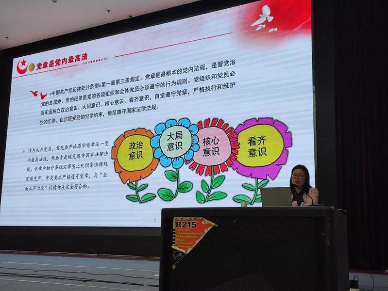 首先,汪辉向大家讲解了为什么“党章是党内最高法”。其原因有三:第一,它是党的整体意志的体现。第二,它是党内的普遍行为规范。第三,它是具有最高权威的党内法规。同时党章是党员的必修课,它对一个党员应该是什么样的人作出了明确规范:中国共产党党员是中国工人阶级的有共产主义觉悟的先锋战士。中国共产党党员必须全心全意为人民服务,不惜牺牲个人的一切,为实现共产主义奋斗终身。中国共产党党员永远是劳动人民的普通一员。除了法律和政策规定范围内的个人利益和工作职权以外,所有共产党员都不得谋求任何私利和特权。