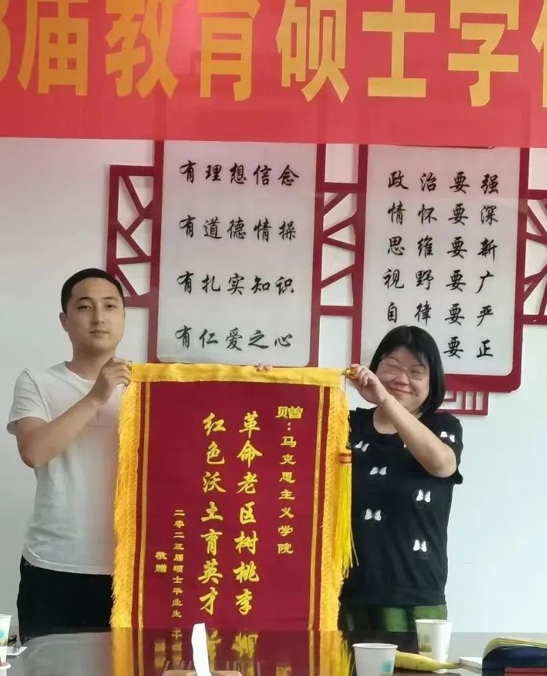 优秀毕业生代表学科思政20级毕业生王世枭鉴代表全体毕业生向公司赠送写有“革命老区树桃李,红色沃土育英才”的锦旗,以此表达对母校的深深眷恋、对老师辛勤培养的感激之情。