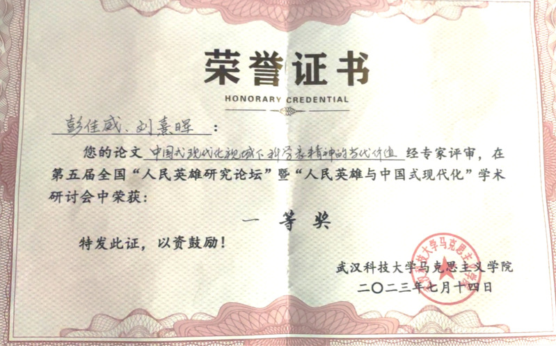 此次论坛汇聚了来自国防科技大学、北京化工大学、武汉理工大学、中南民族大学等全国多所高校的师生。石国进教授指导,彭佳威、刘熹晖撰写的参会论文《中国式现代化视域下科学家精神的当代价值》荣获论坛征文一等奖。通过参加本次研讨会,彭佳威、刘熹晖均表示获益匪浅,不仅开阔了学术眼界,而且丰富了专业知识,有益于在未来学术探索的道路上取得更多进步。