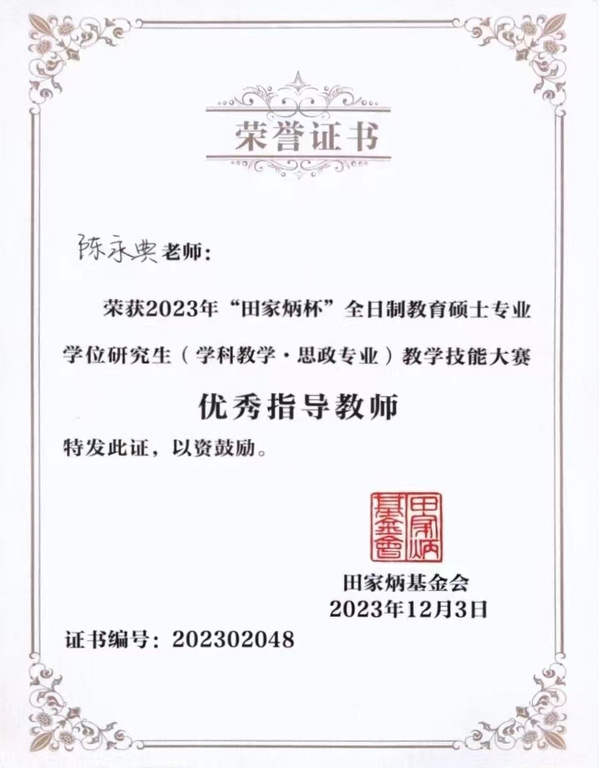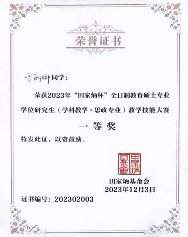 公司伟德源自英国始于19462021级学科教学(思政)专业于丽娜在2023年全国“田家炳杯”全日制教育硕士专业学位研究生学科教学(思政)教学技能大赛中荣获一等奖,陈永典老师获评优秀指导教师奖。