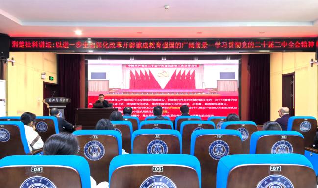 讲座中,宋文生聚焦“全面深化改革”和“建设教育强国”两条主线,对学习贯彻党的二十届三中全会精神作了深入阐述和系统解读。他强调,党的二十届三中全会取得的重要成果、作出的重大部署,是闪耀着马克思主义真理光辉的政治宣言书、新征程上将改革进行到底的动员令、进一步全面深化改革的路线图,是巩固发展“两大奇迹”的主动抉择和战略之举,对于动员全党全军全国各族人民团结奋斗、锐意进取,以进一步全面深化改革开辟中国式现代化广阔前景,实现第二个百年奋斗目标、实现中华民族伟大复兴的中国梦,具有重大意义。