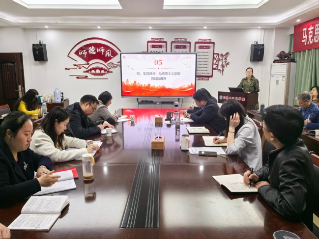 余晚霞以《认真落实“两会”精神推动马院高质量发展》为题,系统解读了2025年全国“两会”精神要义。党课聚焦五个方面内容:一是从两会时间节点、历史定位、创新亮点等方面对2025年全国两会概况与历史坐标进行了解读;二是从经济发展、民生保障、教育改革等方面对国家发展的关键数据进行了解读;三是分析了经济、科技创新、民生等政策背后的马克思主义理论逻辑;四是分析了“两会”对高等教育高质量发展具有重要意义;五是从创新党建引领工程、实施思政课程升级计划、瞄准科研攻关方向、创新社会服务举措等方面提出了推动学院高质量发展的创新举措。