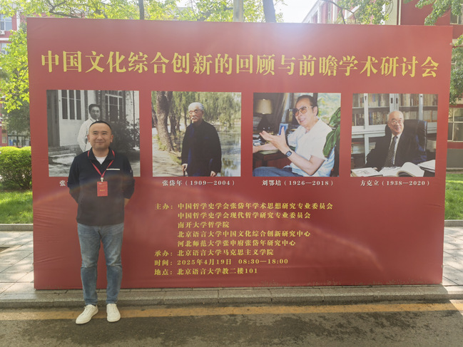 为深入学习和贯彻习近平文化思想,进一步推动马克思主义哲学中国化研究,2025年4月19日,在北京语言大学举行了由中国哲学史学会张岱年学术思想研究专业委员会、中国哲学史学会现代哲学专业委员会等单位主办的“中国文化综合创新的回顾与前瞻”学术研讨会。来自北京大学、清华大学、南开大学、中山大学、武汉大学、中国人民大学、中国社会科学院大学、吉林大学和华东师范大学等高校的八十余位学者参与了本次交流。