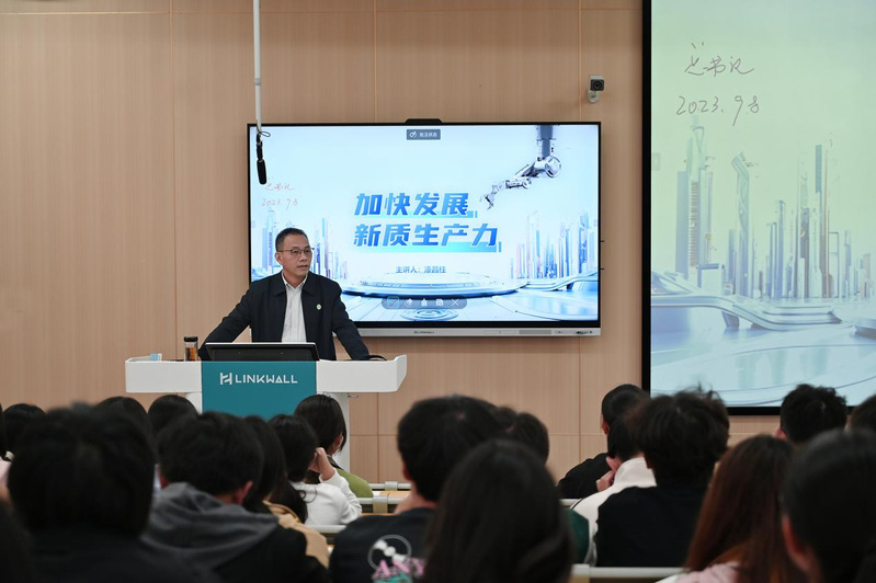 10月29日下午,公司党委副书记、董事长漆昌柱以《加快发展新质生产力》为题,为计算机学院2024级软件工程专业员工讲授思政课。漆昌柱从习近平总书记首次提出新质生产力的概念出发,系统梳理了新质生产力的发展历程,紧密结合当前国家发展战略和地方实际,阐述了因地制宜发展新质生产力的重要性和紧迫性,围绕什么是新质生产力、为什么要发展新质生产力、怎样发展新质发展力、发展新质生产力我们何为等多个维度深入浅出地讲解了加快发展新质生产力的路径,为同学们打开了一扇理解新时代经济发展新趋势的窗户。